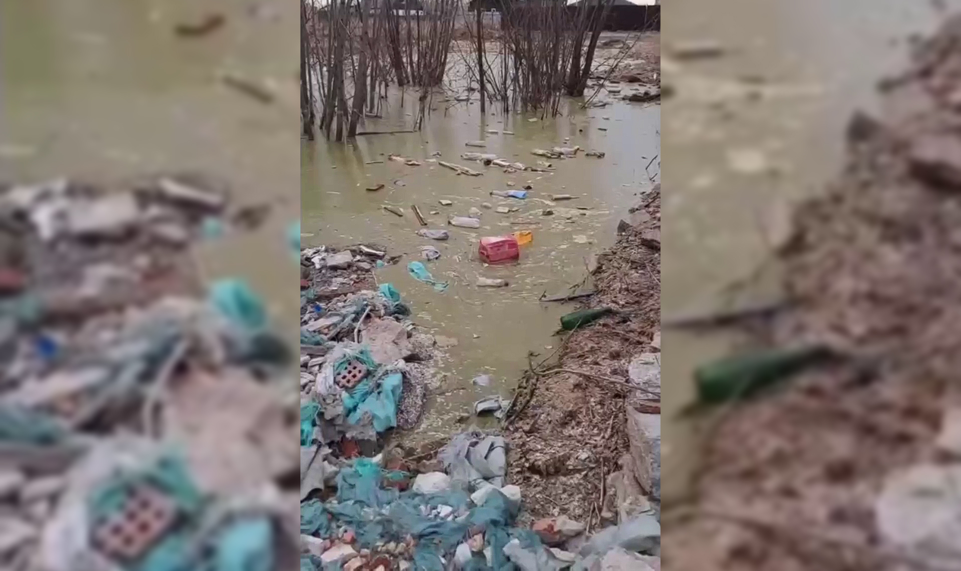 В копейском посёлке Бажово образовалась мусорная река: затопило несанкционированную свалку. Местное болото разлилось на строительные и бытовые отходы.