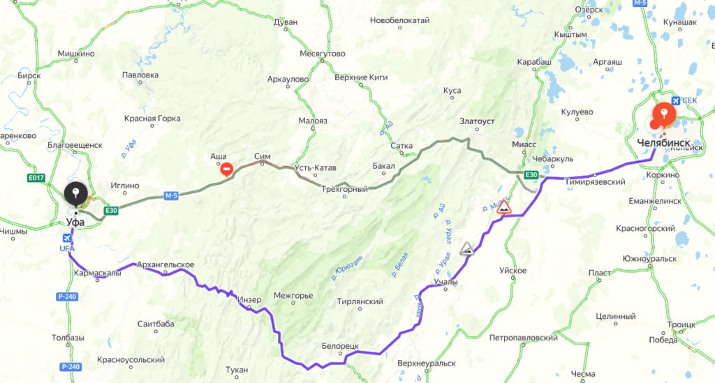Для водителей легковушек «Яндекс Карты» показывают более короткий путь – через Учалы, Белорецк и Инзер. Для прохождения маршрута от Челябинска до Уфы понадобится 7,5 часов.