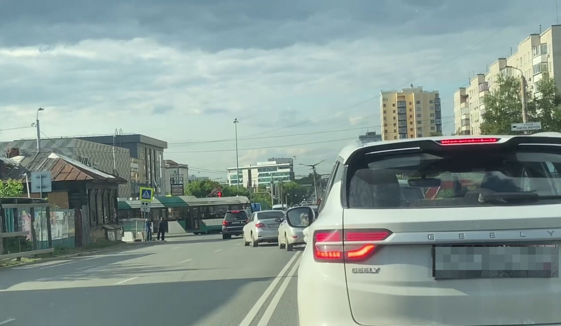 Тем не менее, водители от безысходности объезжают участок дороги, где ведутся работы. Они выезжают на встречную полосу, проезжая по трамвайным путям, чтобы попасть на незакрытые две полосы, которые ведут на улицу Труда.