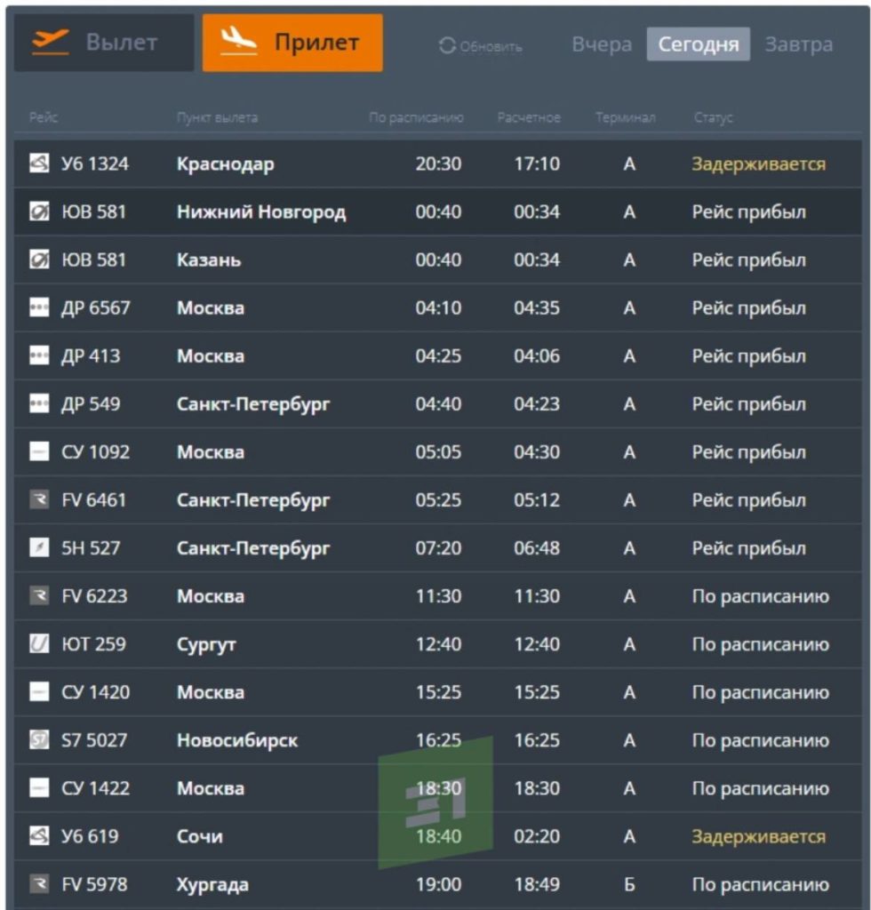 Также в 20:30 в Челябинск должен был прилететь рейс из Краснодара, его перенесли на 17:10 понедельника.